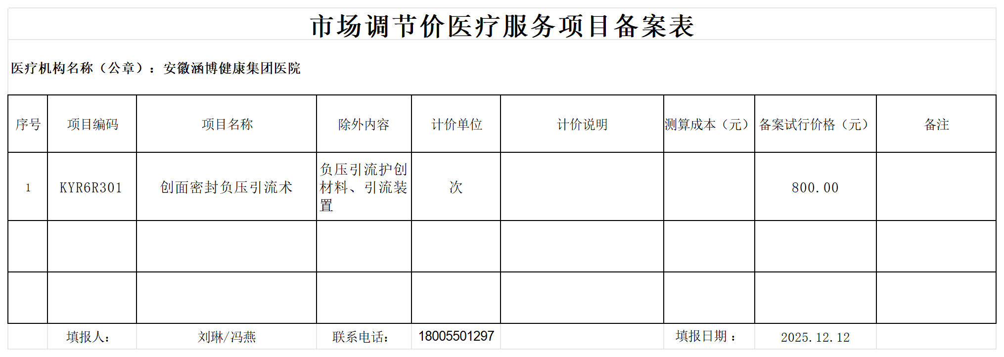 2025年12月市场调节价医疗服务项目备案表